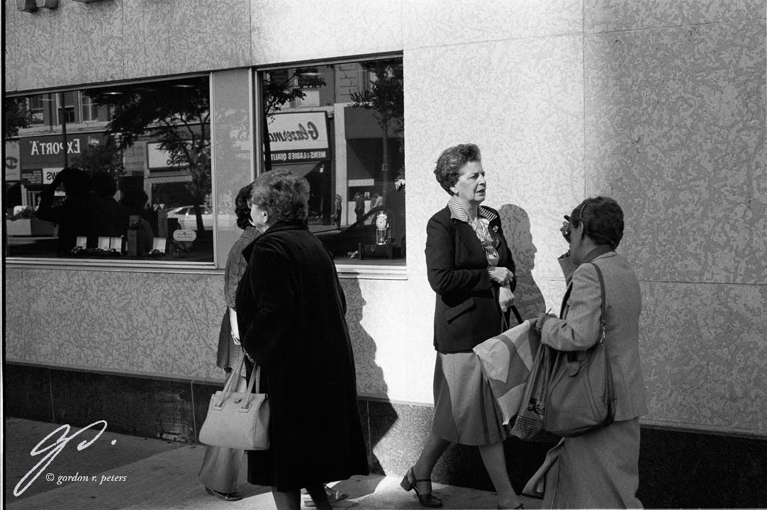 This was taken in front of Birks on Portage Avenue at Smith Street. I remember going in there to look at the silver, silver trays, dishes, cutlery, that kind of thing. No one wants that stuff anymore since it takes work just keeping it tarnish free. They also had a huge display of gold charms for bracelets, and since gold was not anywhere near as valuable as it is now, they weren't expensive. I have a charm bracelet including charms given to me by my husband to celebrate the birth of each of our babies and others to celebrate my 25th and 50th birthday given by my parents. This picture calls all that to mind and also the time when women went downtown to shop, now very much in the past.